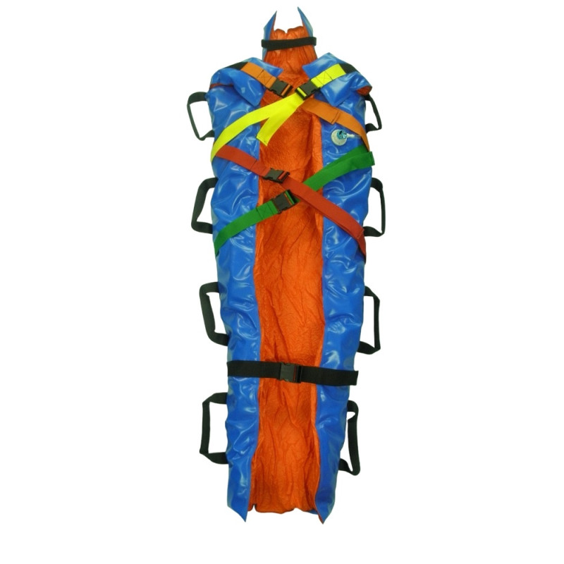 Colchón de vacío de 110/130 x 216 cm con 8 asas repartidas longitudinalmente a ambos lados 4, cierres de liberación rápida con código de colores y una tira de sujeción tipo velcro para la frente. Está compuesto de una cámara de vacío rellena de perla de poliestireno expandido, para una mejor adaptabilidad del paciente. Válvula de vacío fabricada en PVC con sistema de cierre giratorio ON/OFF.