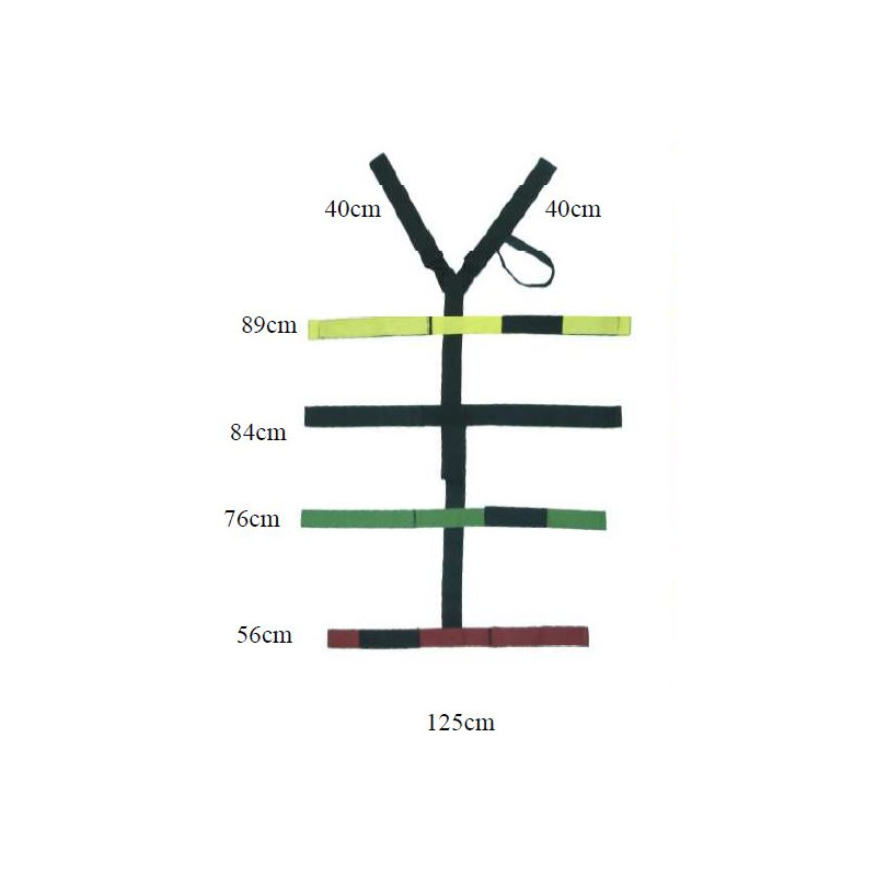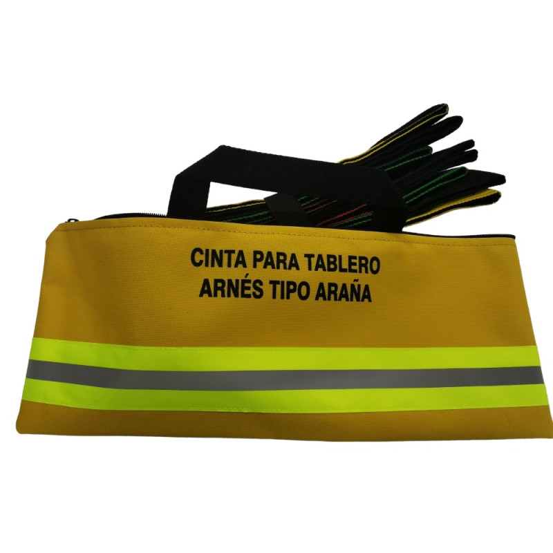 Sistema de correas de sujección para asegurar pacientes en tableros espinales, camillas, etc. Consta de 10 puntos de aseguramiento para la inmovilización mediantes cintas con código de colores y cierre tipo velcro.