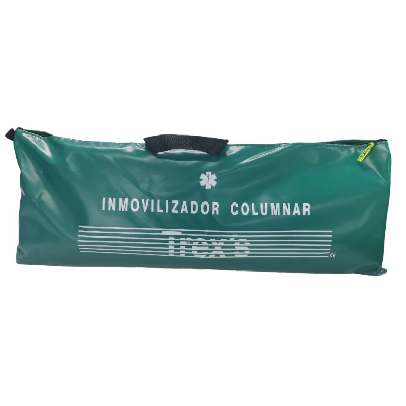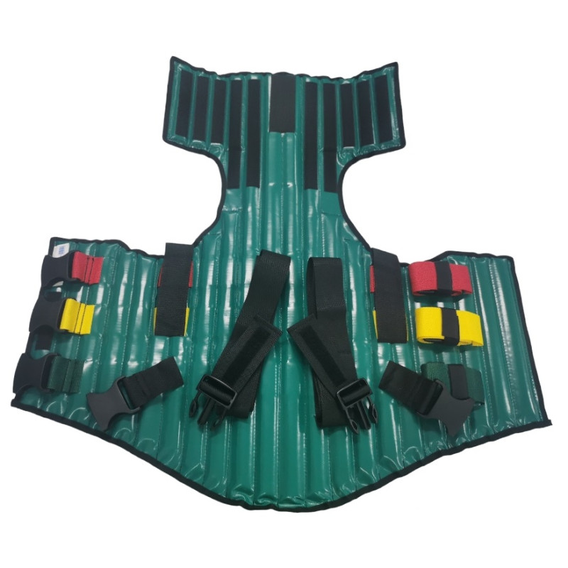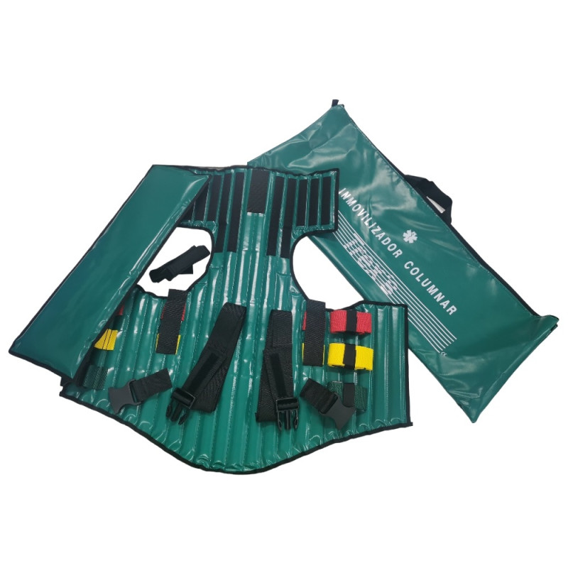 Chaleco rígido para inmovilizar al paciente en posición sentado para su posterior traslado. Está dotado de 3 cintas de colores con cierre de liberación rápida para la sujeción torácica. Dos cintas negras con cierres de liberación rápida para sujeción inguinal. Dos cintas tipo velcro con almohadilla para sujeción cefálica (tanto frente como mentón).